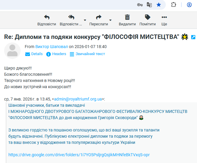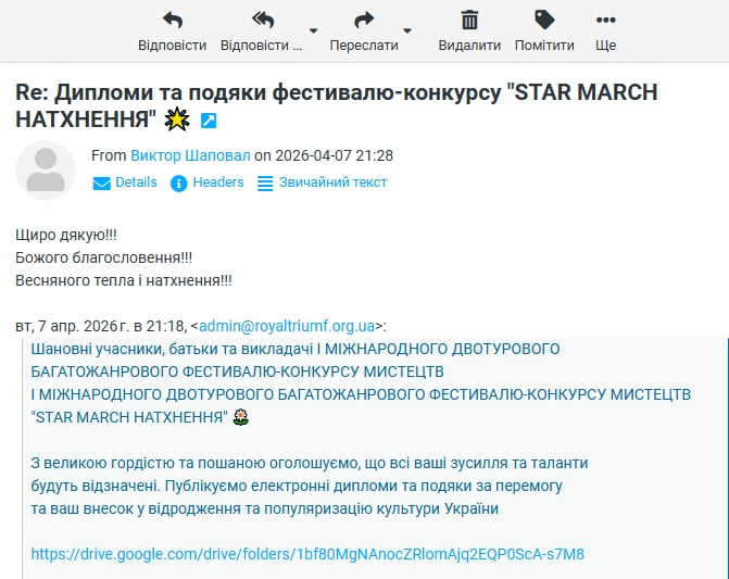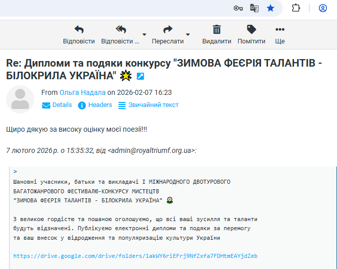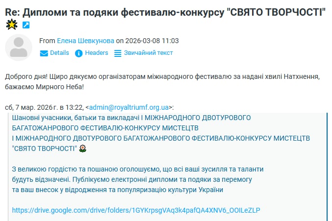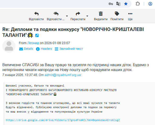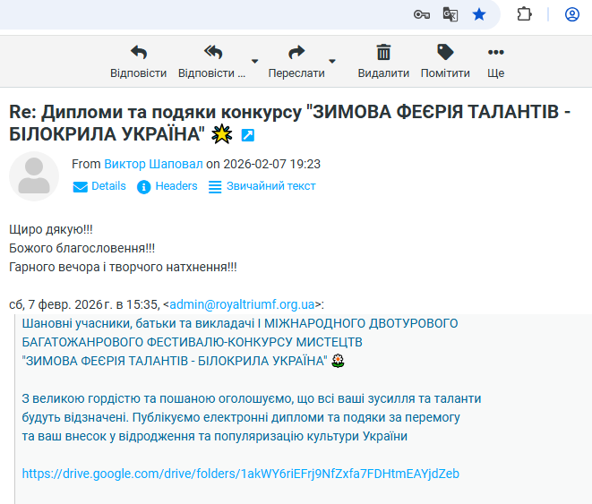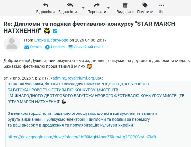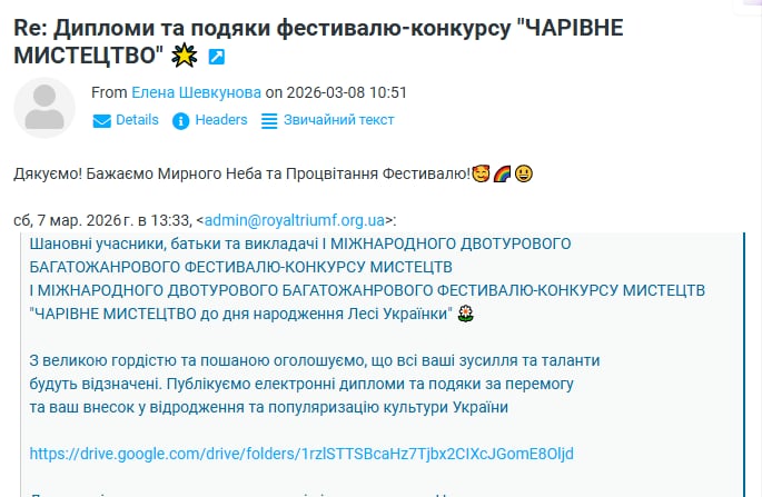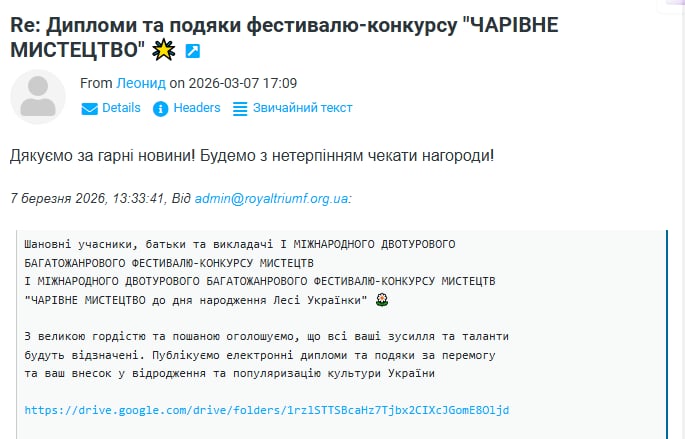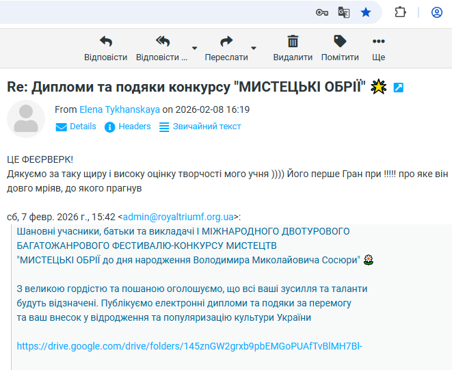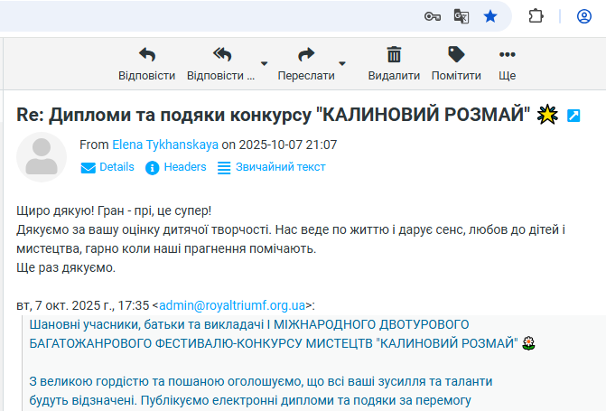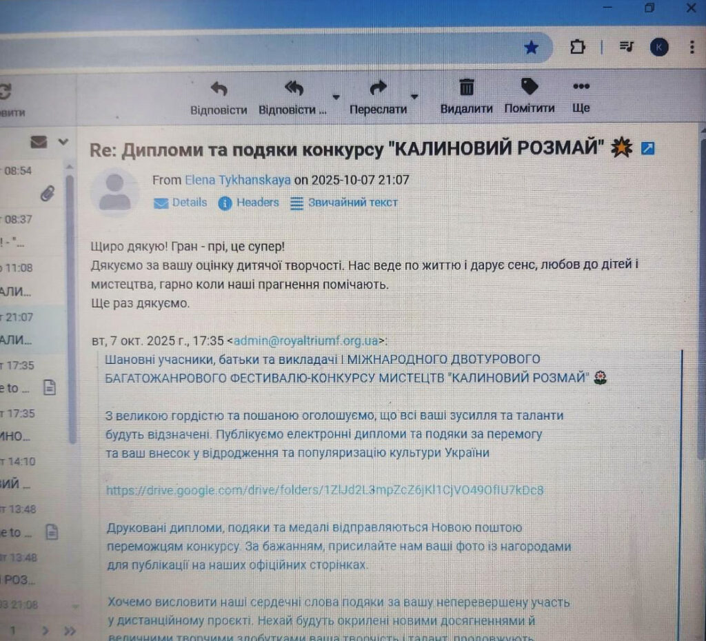 ВІДГУКИ Будь ласка, залиште це поле порожнімЗалишайтесь з нами! Підпишіться, щоб отримувати наші останні новини про актуальні Конкурси та Фестивалі прямо на вашу поштову скриньку Перевірте свою поштову скриньку або папку зі спамом, щоб підтвердити підписку.